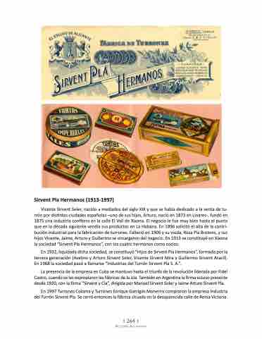 Vicente Sirvent Soler, nacido a mediados del siglo XIX y que se había dedicado a la venta de tu- rrón por distintas ciudades españolas –uno de sus hijos, Arturo, nació en 1873 en Linares-, fundó en 1875 una industria confitera en la calle El Vall de Xixona. El negocio le fue muy bien hasta el punto que en la década siguiente vendía sus productos en La Habana. En 1896 solicitó el alta de la contri- bución industrial para la fabricación de turrones. Falleció en 1906 y su viuda, Rosa Pla Brotons, y sus hijos Vicente, Jaime, Arturo y Guillermo se encargaron del negocio. En 1913 se constituyó en Xixona la sociedad “Sirvent Pla Hermanos”, con los cuatro hermanos como socios.