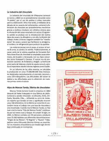 Marcos Tonda Soriano fundó la empresa en 1864 después de haber trabajado en una fábrica de jabón. Comenzó a vender chocolate en Alicante, Elche, Ori- huela, Novelda, Elda..., utilizando su carro de mulas. Un reparto que duraba un mes y significaba recorrer unos 160 kilómetros. En la fábrica se convirtió en cos- tumbre iniciar el trabajo con una taza de chocolate y una ensaimada. Cuando murió Marcos Tonda, su hijo Juan creó la marca “Hijo de Marcos Tonda”, continua- da por los nietos Juan y Gaspar. Al cumplir el siglo, en 1964, la fábrica contaba con 50 personas y producía unas 25.000 tabletas con diferentes denominaciones: “Virgen de las Nieves”, “El Negrito” y “Buana”. Traba- jadores como Edmundo Sánchez Gómez se convirtie- ron en maestros chocolateros con medio siglo de tra- bajo continuado en la empresa.