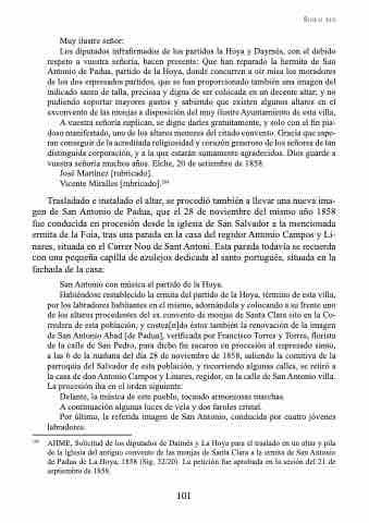 A vuestra señoría suplican, se digne darles gratuitamente, y solo con el fin pia- doso manifestado, uno de los altares menores del citado convento. Gracia que espe- ran conseguir de la acreditada religiosidad y corazón generoso de los señores de tan distinguida corporación, y a la que estarán sumamente agradecidos. Dios guarde a vuestra señoría muchos años. Elche, 20 de setiembre de 1858.