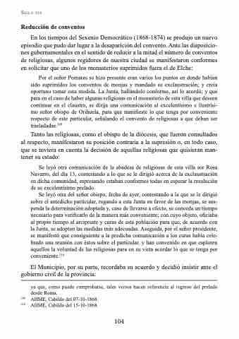 Se leyó otra del señor obispo, fecha de ayer, contestando a la que se le dirigió sobre el antedicho particular, rogando a esta Junta en favor de las monjas, se sus- penda la determinación adoptada y, caso de llevarse a efecto, se conceda un tiempo necesario para verificarlo de la manera más conveniente; con cuyo objeto, oficiaba al propio tiempo al arcipreste y curas de esta población para que, de acuerdo con la Junta, se adopten las medidas más adecuadas. Aseguida, por el señor presidente, se manifestó que consiguiente a la predicha comunicación a los curas había cele- brado una reunión con éstos sobre el particular, y han convenido en que esploren aquellos la voluntad de las religiosas para en su vista acordar lo que se tenga por conveniente.210