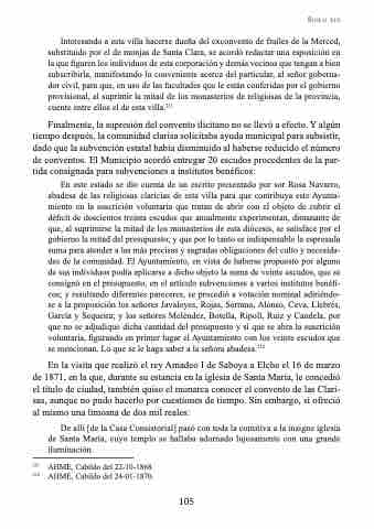 Interesando a esta villa hacerse dueña del exconvento de frailes de la Merced, substituido por el de monjas de Santa Clara, se acordó redactar una esposición en la que figuren los individuos de esta corporación y demás vecinos que tengan a bien subscribirla, manifestando lo conveniente acerca del particular, al señor goberna- dor civil, para que, en uso de las facultades que le están conferidas por el gobierno provisional, al suprimir la mitad de los monasterios de religiosas de la provincia, cuente entre ellos el de esta villa.211