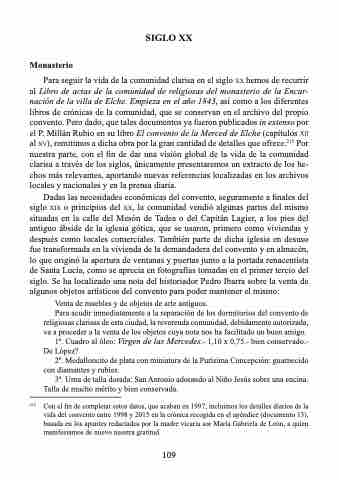 Para seguir la vida de la comunidad clarisa en el siglo xx hemos de recurrir al Libro de actas de la comunidad de religiosas del monasterio de la Encar- nación de la villa de Elche. Empieza en el año 1843, así como a los diferentes libros de crónicas de la comunidad, que se conservan en el archivo del propio convento. Pero dado, que tales documentos ya fueron publicados in extenso por el P. Millán Rubio en su libro El convento de la Merced de Elche (capítulos xII al xv), remitimos a dicha obra por la gran cantidad de detalles que ofrece.215 Por nuestra parte, con el fin de dar una visión global de la vida de la comunidad clarisa a través de los siglos, únicamente presentaremos un extracto de los he- chos más relevantes, aportando nuevas referencias localizadas en los archivos locales y nacionales y en la prensa diaria.