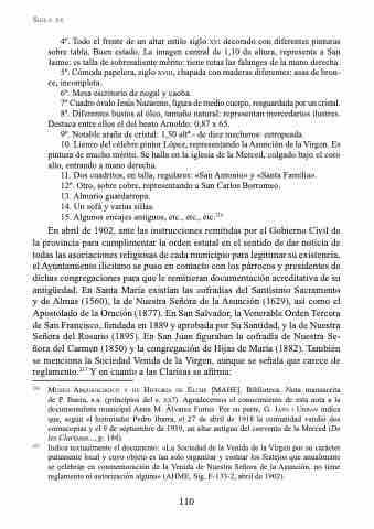 En abril de 1902, ante las instrucciones remitidas por el Gobierno Civil de la provincia para cumplimentar la orden estatal en el sentido de dar noticia de todas las asociaciones religiosas de cada municipio para legitimar su existencia, el Ayuntamiento ilicitano se puso en contacto con los párrocos y presidentes de dichas congregaciones para que le remitieran documentación acreditativa de su antigüedad. En Santa María existían las cofradías del Santísimo Sacramento y de Almas (1560), la de Nuestra Señora de la Asunción (1629), así como el Apostolado de la Oración (1877). En San Salvador, la Venerable Orden Tercera de San Francisco, fundada en 1889 y aprobada por Su Santidad, y la de Nuestra Señora del Rosario (1895). En San Juan figuraban la cofradía de Nuestra Se- ñora del Carmen (1850) y la congregación de Hijas de María (1882). También se menciona la Sociedad Venida de la Virgen, aunque se señala que carece de reglamento.217 Y en cuanto a las Clarisas se afirma: