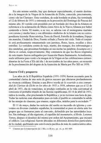 Los años de la II República Española (1931-1939) fueron escenario para la comunidad clarisa de una serie de graves sucesos que alteraron profundamente su vivencia cotidiana. Gracias a una Breve reseña de lo ocurrido a esta comuni- dad de Clarisas de Elche en los años de 1931 a 1936, sabemos que ya el 12 de abril de 1931, día de votaciones, se produjo confusión en la vida conventual al conocerse el probable triunfo de las fuerzas republicanas. El 14 de abril de 1931, indica la reseña, «fue proclamada la República y ya no tuvimos una hora de paz. Todas las noticias eran alarmantes pues en todo el pueblo se comentaba la salida de las monjas de clausura, que eramos, según ellos, inútiles para la sociedad».225