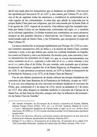 Fue de este último monasterio de donde salieron las monjas fundadoras del convento de San Juan Bautista de la Penitencia de Orihuela, creado en 1493.3 Y, a su vez, tres religiosas de este convento orcelitano fundaron el convento de Elche, que, constituido el 1 de mayo de 1516, inició su andadura el 1 de enero de 1517. Dos años después se fundaba también el convento de Clarisas de la Santa Faz, en San Juan de Alicante, aunque éste bajo la influencia del monaste- rio de Santa Clara de Gandia.4