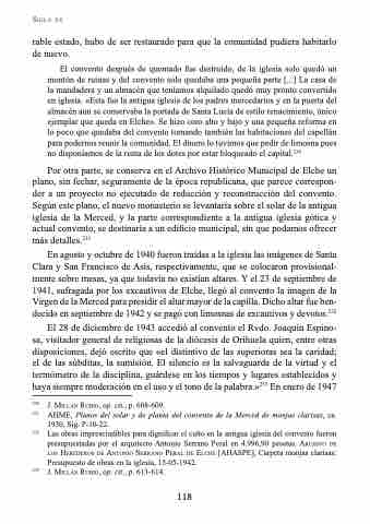 Por otra parte, se conserva en el Archivo Histórico Municipal de Elche un plano, sin fechar, seguramente de la época republicana, que parece correspon- der a un proyecto no ejecutado de reducción y reconstrucción del convento. Según este plano, el nuevo monasterio se levantaría sobre el solar de la antigua iglesia de la Merced, y la parte correspondiente a la antigua iglesia gótica y actual convento, se destinaría a un edificio municipal, sin que podamos ofrecer más detalles.231