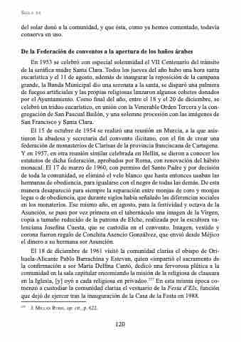 El 18 de diciembre de 1961 visitó la comunidad clarisa el obispo de Ori- huela-Alicante Pablo Barrachina y Estevan, quien «impartió el sacramento de la confirmación a sor María Delfina Cantó, dedicó una fervorosa plática a la comunidad en la sala capitular encomiando la misión de la religiosa de clausura en la Iglesia, [y] oyó a cada religiosa en privado».237 En esta misma época co- menzó a custodiar la comunidad clarisa el vestuario de la Festa d’Elx, función que dejó de ejercer tras la inauguración de la Casa de la Festa en 1988.