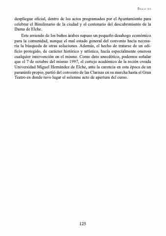 Este arriendo de los baños árabes supuso un pequeño desahogo económico para la comunidad, aunque el mal estado general del convento hacía necesa- ria la búsqueda de otras soluciones. Además, el hecho de tratarse de un edi- ficio protegido, de carácter histórico y artístico, hacía especialmente onerosa cualquier intervención en el mismo. Como dato anecdótico, podemos señalar que el 7 de octubre del mismo 1997, el cortejo académico de la recién creada Universidad Miguel Hernández de Elche, ante la carencia en esta época de un paraninfo propio, partió del convento de las Clarisas en su marcha hasta el Gran Teatro en donde tuvo lugar el solemne acto de apertura del curso.