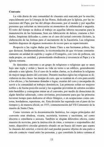 Se denomina convento a un grupo de religiosos o religiosas que se unen bajo una regla y orden y hacen su vida en torno a un edificio, generalmente adosado a una iglesia. En el caso de la orden clarisa, es la abadesa la religiosa de mayor rango dentro del convento. Durante muchos siglos las religiosas se di- vidieron en dos clases: las monjas de coro, que se reunían en el coro para asistir a los oficios, y las hermanas donadas o legas, exentas del coro y encargadas de servir a la comunidad en trabajos domésticos. Las primeras solían ser mujeres nobles o de buena posición social y las segundas provenían de estratos sociales más humildes y conseguían entrar en el convento, por medio de donaciones de algún familiar adinerado, como sirvientas, precisamente para que las primeras tuvieran tiempo para dedicarse al oficio litúrgico, o en ocupaciones como can- toras, bordadoras, reposteras, etc. Esta división fue superada con el paso de los tiempos y, de manera oficial, en 1953, conmemoración del VII Centenario de la muerte de Santa Clara.