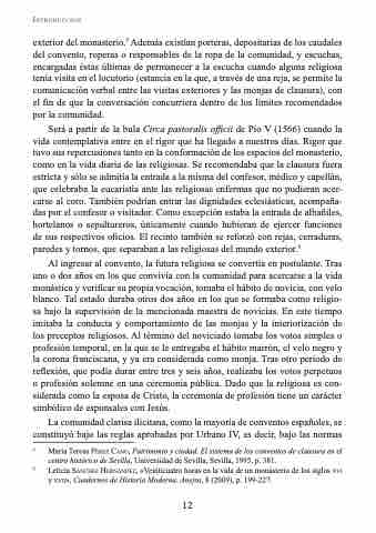 Al ingresar al convento, la futura religiosa se convertía en postulante. Tras uno o dos años en los que convivía con la comunidad para acercarse a la vida monástica y verificar su propia vocación, tomaba el hábito de novicia, con velo blanco. Tal estado duraba otros dos años en los que se formaba como religio- sa bajo la supervisión de la mencionada maestra de novicias. En este tiempo imitaba la conducta y comportamiento de las monjas y la interiorización de los preceptos religiosos. Al término del noviciado tomaba los votos simples o profesión temporal, en la que se le entregaba el hábito marrón, el velo negro y la corona franciscana, y ya era considerada como monja. Tras otro periodo de reflexión, que podía durar entre tres y seis años, realizaba los votos perpetuos o profesión solemne en una ceremonia pública. Dado que la religiosa es con- siderada como la esposa de Cristo, la ceremonia de profesión tiene un carácter simbólico de esponsales con Jesús.
