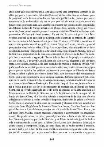 en lo altar que està edificat en la dita casa e sonà una campaneta damunt lo dit altar, pregant e requerint al dit notari [blanco] de les dites coses e de haver pres la possessió en la forma sobredita ne fasa acte públich e fe, portant per haver memòria en lo esdevenidor de tot lo qual per mí, dit notari e yusia escrit ne fonch rebut lo present acte. A lo qual foren presents per testimonis los magnífichs en Alfonso Lopes de Varea, notari, e en Diego Ruis, vehins d’Elig. et postea vero die jovis prima mensis januarii anno a nativitate Domini millesimo qui- gentessimo decimo (decimo) septimo. En est dia, lo reverent pare frare Pere Molins, custodi de la custòdia de Múrsia, e de la partida de Oriola, de l’horde de frares menors del benaventurat pare Sent Fransés, atteNeNt e considerant que en dies pasats lo molt magnífich mosén Diego de Luxan, cavaller, general procurador e batle de les viles d’Elig, Asp e Crevillent, e los magnífichs en Pere de Alenda, justícia [blanco] de la dita vila d’Elig, e en Johan de Alenda, jurat de la dita vila e majordom de la casa que lo magnífich Consell de la dita vila com- prà, hort e saboneria e aygua, de l’honorable en Bernat Perpinyà, e tenint poder del dit Consell, e en Jordi Castell, jurat de la dita vila, plegaren a ell, dit pare frare Pere Molins, custodi de la dita custòdia de Múrsia e ciutat de Oriola, vol- gués, en deute de caritat, pendre e acceptar la dita casa, hort e saboneria e aygua per a que en aquella fos edificat un monestir de monges de l’horde de Senta Clara, a llohor e glòria de Nostre Señor Déu, sots invocació del benaventurat Sent Jordi, e aprés perquè la casa, antigua església, del benaventurat Sent Jordi, que és en la dita e present vila, no vengués a menys, fonch mudada la invocació sots invocació de Nostre Redemptor Jhesucrist, la qual dita casa, hort e sabone- ria e aygua per a obs de fer lo dit monestir de monges del dit horde de Senta Clara, per ell fonch acceptada en lo dit nom de custodi de la dita custòdia de Múrsia e ciutat de Oriola, la dita casa per a fer lo dit monestir de monges del dit horde de Senta Clara, ell e los dits ofisials e majordom de la dita casa ab tota diligènsia e solicitut e molts treballs e despeses, innvocant la gràcia de Nostre Señor Déu, e aportant la dita casa en estament y deixant estar en aquella les reverents dona Magdalena de Luxan e Francisca Lopes, Catalina Fontes e Àn- gela Martinez e Anna Manena, monjes del dit horde de Senta Clara: peR so, lo dit pare frare Molins, estant presents, consentin e corroborant los magnífics mosén Diego de Luxan, cavaller, general procurador e batle desús dit, e en Jo- han Bonmatí, jurats de part de la dita vila, y en Johan de Alenda, jurat de la dita vila e majordom de la dita casa, e Johan Castell, altre dels dits jurats [blanco] et gratis cedex e transporta, lliura, eo casi lliura, en la millor forma e manera, causa e dret y pot e deu, la dita casa e hort e saboneria e aygua a les dites mon- jes del dit monestir, per a que aquella dita casa e ort e saboneria e aygua in