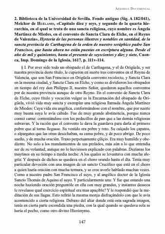 2. Biblioteca de la Universidad de Sevilla. Fondo antiguo (Sig. A 182/041), Melchor de Huélamo, «Capítulo diez y seys, y segundo de la quarta hie- rarchía, en el qual se trata de una sancta religiosa, cuyo nombre es Ángela Martínez de Miedes, en el convento de Sancta Clara de Elche, en el Reyno de Valenzia», Hystoria de las personas illustres y notables en santidad, de la sancta provincia de Carthagena de la orden de nuestro seráphico padre San Francisco, que hasta ahora no están puestas en escriptura alguna. Desde el año de mil y quinientos, hasta el presente de seyscientos y diez y siete, Cuen- ca, Imp. Domingo de la Iglesia, 1617, p. 111v-114.