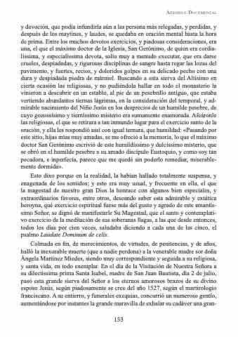 y devoción, que podía infundirla aún a las persona más relegadas, y perdidas, y después de los maytines, y laudes, se quedaba en oración mental hasta la hora de prima. Entre los muchos devotos exercicios, y piadosas consideraciones, era una, el que el máximo doctor de la Iglesia, San Gerónimo, de quien era cordia- líssima, y especialíssima devota, solía muy a menudo executar, que era darse crueles, despiadadas, y rigurosas disciplinas de sangre hasta regar las lozas del pavimento, y fuertes, recios, y doloridos golpes en su delicado pecho con una dura y despiadada piedra de mármol. Buscando a esta sierva del Altísimo en cierta ocasión las religiosas, y no pudiéndola hallar en todo el monasterio la vinieron a descubrir en un establo, al pie de un pesebrillo antiguo, que estaba vertiendo abundantes tiernas lágrimas, en la consideración del temporal, y ad- mirable nacimiento del Niño Jesús en los desprecios de un humilde pesebre, de cuyo gozossísimo y tierníssimo misterio era sumamente enamorada. Afeáronle las religiosas, el que se retirara a tan inmundo lugar para el exercicio santo de la oración, y ella les respondió assí con igual ternura, que humildad: «Pasando por este sitio, hijas mías muy amadas, se me ofreció a la memoria, lo que el máximo doctor San Gerónimo escrivió de este humildíssimo y dulcíssimo misterio, que se obró en el humilde pesebre a su amado discípulo Eustoquio, y como soy tan pecadora, e inperfecta, parece que me quedé sin poderlo remediar, miserable- mente dormida».