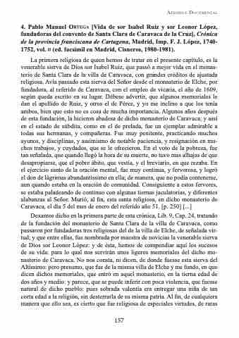 4. Pablo Manuel ortega [Vida de sor Isabel Ruiz y sor Leonor López, fundadoras del convento de Santa Clara de Caravaca de la Cruz], Crónica de la provincia franciscana de Cartagena, Madrid, Imp. F. J. López, 1740- 1752, vol. ii (ed. facsímil en Madrid, Cisneros, 1980-1981).