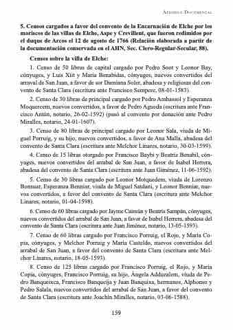 5. Censos cargados a favor del convento de la Encarnación de Elche por los moriscos de las villas de Elche, Aspe y Crevillent, que fueron redimidos por el duque de Arcos el 12 de agosto de 1766 (Relación elaborada a partir de la documentación conservada en el AHN, Sec. Clero-Regular-Secular, 88).