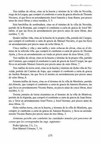 Cinco taúllas y viña y una taúlla y siete ochavas de olivar, citas en el tér- mino de la referida villa, que compró el combento a carta de gracia de Thomás Ayala, y lleva en arrendamiento su viuda en precio anuo de dose libras, [12].