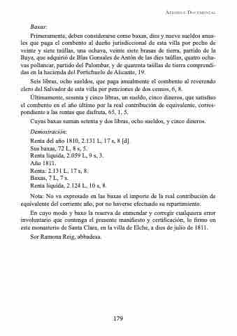 Primeramente, deben considerarse como baxas, dies y nueve sueldos anua- les que paga el combento al dueño jurisdiccional de esta villa por pecho de veinte y siete taúllas, una ochava, veinte siete brasas de tierra, partido de la Baya, que adquirió de Blas Gonsales de Antón de las dies taúllas, quatro ocha- vas pollancar, partido del Palombar, y de quarenta taúllas de tierra comprendi- das en la hacienda del Portichuelo de Alicante, 19.