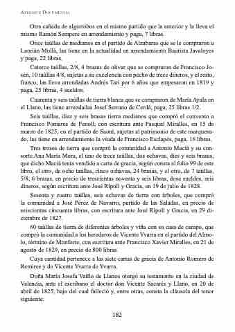 Seis taúllas, diez y seis brasas tierra medianos que compró el convento a Francisco Pomares de Fenoll, con escritura ante Pasqual Miralles, en 15 de marzo de 1825, en el partido de Saoní, sujetas al patrimonio de este marquesa- do, las tiene en arrendamiento la viuda de Francisco Esclapés, paga, 16 libras.