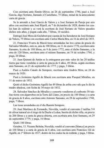 29. José Martínez de Fernando, Novelda, vendió al convento 2 taúllas 3/4 de olivar natural en el riego de la Duela o Ledua, huerta de dicha villa, en precio de 200 libras y a carta de gracia abierta, con escritura ante José Sansano, en 29 de septiembre 1779, y paga, 10 libras.
