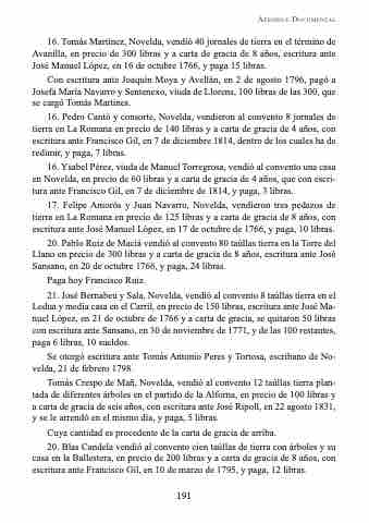 16. Tomás Martínez, Novelda, vendió 40 jornales de tierra en el término de Avanilla, en precio de 300 libras y a carta de gracia de 8 años, escritura ante José Manuel López, en 16 de octubre 1766, y paga 15 libras.