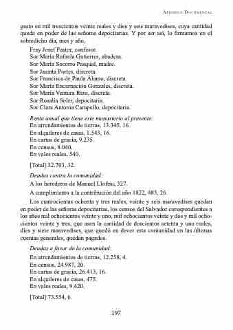 Los cuatrocientas ochenta y tres reales, veinte y seis maravedises quedan en poder de las señoras depocitarias, los censos del Salvador corespondientes a los años mil ochocientos veinte y uno, mil ochocientos veinte y dos y mil ocho- cientos veinte y tres, que asen la cantidad de doscientos setenta y uno reales, dies y siete maravedises, que quedó en dever esta comunidad en las últimas cuentas generales, quedan pagados.