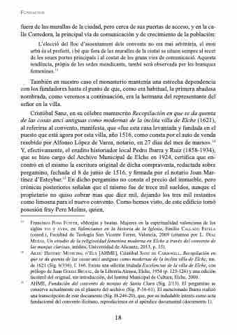 Francisco poNs FusteR, «Monjas y beatas. Mujeres en la espiritualidad valenciana de los siglos xvI y xvII», en Valencianos en la historia de la Iglesia, Emilio callado estela (coord.), Facultad de Teología San Vicente Ferrer, Valencia, 2009 (citamos por L. díaz MeJías, Un estudio de la religiosidad femenina moderna en Elche a través del convento de las monjas clarisas, inédito, Universidad de Alicante, 2013, p. 15).