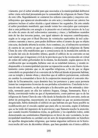viamente, por el señor alcalde para que asociados a la municipalidad deliberen sobre cierta solicitud presentada por la comunidad de religiosas de Santa Clara de esta villa. Seguidamente se contaron los señores concejales y mayores con- tribuyentes que aparecen encabezados en esta acta y resultaron ser catorce los primeros incluso el señor alcalde e igual número los segundos. En este estado el señor presidente manifestó, que siendo veinte los concejales que correspon- den a esta población con arreglo a lo prescrito en el artículo tercero de la Ley de ocho de enero de mil ochocientos cuarenta y cinco; y hallándose reunidos más de las dos terceras partes, con igual número de mayores contribuyentes, según se le exige por el Real Decreto de veintiocho septiembre de mil ocho- cientos cuarenta y nueve, para poder deliberar sobre el asunto de que es objeto esta acta, declaraba abierta la sesión. Acto contínuo, yo, el infrascrito secretario di cuenta de un escrito en que la abadesa y comunidad de religiosas de Santa Clara de esta villa manifiestan que a consecuencia de la inundación sufrida en la noche del seis de diciembre último, quedó el edificio de su convento en tan mal estado que el ingeniero civil de la provincia que le ha reconocido en virtud de orden del señor gobernador de la misma, ha declarado, según aparece de la certificación que acompaña, hallarse casi en su totalidad ruinoso, y siendo in- dispensable a la municipalidad ejecutar su reparación acude a este ilustre Ayun- tamiento como patrono que es de aquellas religiosas, a fin de que se digne concederle en propiedad el ex convento de la Merced donde al presente habitan, con su templo y demás obras y derechos que al edificio pertenezcan, cediendo en cambio la comunidad a favor de la corporación municipal el convento titu- lado de la Encarnación, cuyo dominio hoy les pertenece y para cuya permuta tienen las competentes licencias de sus prelados eclesiásticos. Concluida la lec- tura de este documento, se dio principio a la discusión que fue animada y dete- nida, tomando parte en ella los señores Segura, Ganga, Santamaría, Ruiz y Belda, conviniendo todos en que el Ayuntamiento, como patrono que es de las religiosas de Santa Clara de esta villa desde la fundación del convento, tenía un deber de protegerlas, mayormente en la actualidad en que un acontecimiento desgraciado, había destruido el edificio en que habitan sin que fuese posible su reedificación por el crecido capital que para ello se necesita, según el informe que se ha leído del ingeniero de la provincia y que llamaría mucho la atención, que cuando nuestra bondadosa reyna, su gobierno y los españoles todos, están demostrando sus sentimientos filantrópicos en favor de este vecindario, la mu- nicipalidad manifiesta su caridad con un acto de desprendimiento en beneficio de aquellas desgraciadas religiosas, que tantas angustias sufrieron en la horro- rosa noche del seis de diciembre último, que han quedado sin el único edificio