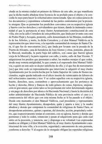 chada en la misma ciudad en primero de febrero de este año, en que manifiesta que la dicha madre abadesa tiene licencia de su prelado para el objeto y le con- cedía la suya para hacer la solicitud antes mencionada. Que en consecuencia de los documentos y espontánea voluntad de las partes contratantes por la presen- te otorgan: Que se permutan los predichos conventos con su respectiva iglesia y huerto con los derechos y servidumbres que tienen, dando la insinuada comu- nidad el que le pertenecía al muy ilustre Ayuntamiento constitucional de esta villa, sito en la calle Corredera de esta población, que linda por levante con casa de Pedro Flujá y Acequia, poniente, calle denominada de las Monjas, mediodía, la de los Árboles, y norte, la dicha Corredera; y el don Manuel Valdivia en la representación que interviene, a la repetida comunidad de monjas de Santa Cla- ra, el que fue de mercenarios [sic], que linda por levante con la posada de la Puerta de Alicante, casa de herederos de José Alonso y otras, poniente, plaza de la Merced, mediodía, la parte baja del edificio, con casas que fueron iglesia vieja de la Merced y la parte superior con calle, y norte, calle de San Vicente. Y adquirieron los predios que permutan a saber, las madres monjas el que ceden, desde muy remota antigüedad, lo que consta a el expresado don Manuel Valdi- via, a quien en este auto se da por satisfecho de ello; y el que fue de mercenarios [sic] que éste cede en representación que interviene le adquirió el muy ilustre Ayuntamiento por la cesión hecha por la Junta Superior de venta de bienes na- cionales, según queda indicado en el oficio inserto de veinticuatro de febrero de mil ochocientos cuarenta y tres: Y se ceden aquellos con su respectiva iglesia, huerto, derechos, usos, costumbres y aprovechamiento que les pertenece de hecho y derecho, libres y francos de todo género de censo, hipoteca, enajena- ción ni gravamen; que como tales se los permutan sin valor determinado alguno y sin pago de derechos por ahora a la Hacienda Nacional y hasta la decisión del señor administrador de Hacienda Pública de esta provincia sobre el caso y a consecuencia del oficio que con esta misma fecha se le ha pasado a el objeto. Desde este momento el don Manuel Valdivia, cual presidente y representante del muy ilustre Ayuntamiento, desapodera, quita y aparta a éste; y la madre abadesa y demás que componen la comunidad de religiosas de Santa Clara, se desapoderan asimismo, quitan y apartan, del derecho, acción, propiedad y seño- río, que respectivamente tenían al convento, con su iglesia, huerto y demás que permutan y todo lo ceden, renuncian y pasan al adquiriente para que cada cual entre en la posesión, y tenencia, use y disponga a su voluntad: Las expresadas madres se obligan y el don Manuel Valdivia, al muy ilustre Ayuntamiento cons- titucional de esta villa, a la evicción, seguridad y saneamiento de esta permuta, conforme a derecho: Y al seguro de lo otorgado obligan las repetidas religiosas