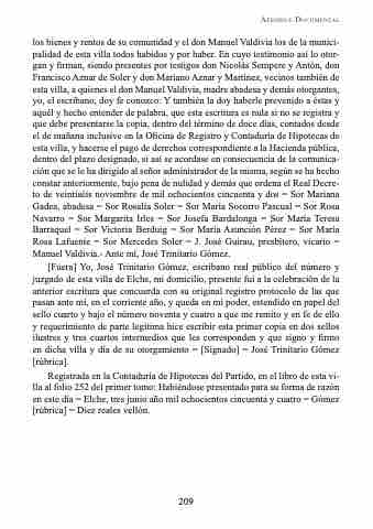 los bienes y rentos de su comunidad y el don Manuel Valdivia los de la munici- palidad de esta villa todos habidos y por haber. En cuyo testimonio así lo otor- gan y firman, siendo presentes por testigos don Nicolás Sempere y Antón, don Francisco Aznar de Soler y don Mariano Aznar y Martínez, vecinos también de esta villa, a quienes el don Manuel Valdivia, madre abadesa y demás otorgantes, yo, el escribano, doy fe conozco: Y también la doy haberle prevenido a éstas y aquél y hecho entender de palabra, que esta escritura es nula si no se registra y que debe presentarse la copia, dentro del término de doce días, contados desde el de mañana inclusive en la Oficina de Registro y Contaduría de Hipotecas de esta villa, y hacerse el pago de derechos correspondiente a la Hacienda pública, dentro del plazo designado, si así se acordase en consecuencia de la comunica- ción que se le ha dirigido al señor administrador de la misma, según se ha hecho constar anteriormente, bajo pena de nulidad y demás que ordena el Real Decre- to de veintiséis noviembre de mil ochocientos cincuenta y dos = Sor Mariana Gadea, abadesa = Sor Rosalía Soler = Sor María Socorro Pascual = Sor Rosa Navarro = Sor Margarita Irles = Sor Josefa Bardalonga = Sor María Teresa Barraquel = Sor Victoria Berduig = Sor María Asunción Pérez = Sor María Rosa Lafuente = Sor Mercedes Soler = J. José Guirau, presbítero, vicario = Manuel Valdivia.- Ante mí, José Trinitario Gómez.