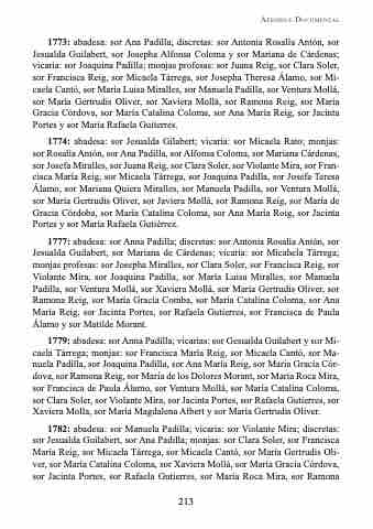 1779: abadesa: sor Anna Padilla; vicarias: sor Gesualda Guilabert y sor Mi- caela Tárrega; monjas: sor Francisca María Reig, sor Micaela Cantó, sor Ma- nuela Padilla, sor Joaquina Padilla, sor Ana María Reig, sor María Gracia Cór- dova, sor Ramona Reig, sor María de los Dolores Morant, sor María Roca Mira, sor Francisca de Paula Álamo, sor Ventura Mollá, sor María Catalina Coloma, sor Clara Soler, sor Violante Mira, sor Jacinta Portes, sor Rafaela Gutierres, sor Xaviera Molla, sor María Magdalena Albert y sor María Gertrudis Oliver.