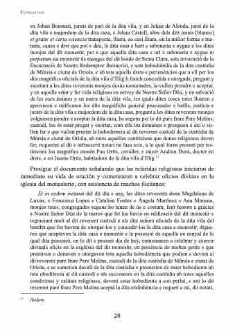en Johan Bonmatí, jurats de part de la dita vila, y en Johan de Alenda, jurat de la dita vila e majordom de la dita casa, e Johan Castell, altre dels dits jurats [blanco] et gratis et certa sciencia transporta, lliura, eo casi lliura, en la millor forma e ma- nera, causa e dret que pot e deu, la dita casa e hort e saboneria e aygua a les dites monjes del dit monestir, per a que aquella dita casa e ort e saboneria e aygua in perpetum sia monestir de monges del dit horde de Senta Clara, sots invocació de la Encarnació de Nostre Redemptor Jhesucrist, e sots hobedièndia de la dita custòdia de Múrsia e ciutat de Oriola, e ab tots aquells drets e pertenències que a ell per los dits magnífics oficials de la dita vila d’Elig li fonch concedida e otorgada, pregant y exortant a les dites reverents monjes desús nomenades, la vullen prendre e aceptar, y en aquella estar y fer vida religiosa en servey de Nostre Señor Déu, y en salvació de les sues ànimes y en onrra de la dita vila, les quals dites coses totes lloaren e aprovaren e ratificaren los dits magnífichs general procurador e batlle, justícia e jurats de la dita vila e majordom de la dita casa, pregant a les dites reverents monjes volguesen pendre e aceptar la dita casa, he segons per lo dit pare frare Pere Molins, custodi, los és estar pregat y exortat, com ells los demanen e prenguen e axí o vu- llen fer e que vullen prestar la hobediència al dit reverent custodi de la custòdia de Múrsia e ciutat de Oriola, ab totes aquelles contrisions que dones religioses deven fer, requerint al dit e infraescrit notari ne fasa acte, a lo qual foren present per tes- timonis los magnífics mosén Pau Ortís, cavaller, e micer Andreu Durà, doctor en drets, e en Jaume Ortís, habitadors de la dita vila d’Elig.17