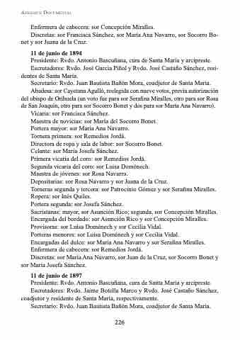 Abadesa: sor Cayetana Agulló, reelegida con nueve votos, previa autorización del obispo de Orihuela (un voto fue para sor Serafina Miralles, otro para sor Rosa de San Joaquín, otro para sor Socorro Bonet y dos para sor María Ana Navarro).