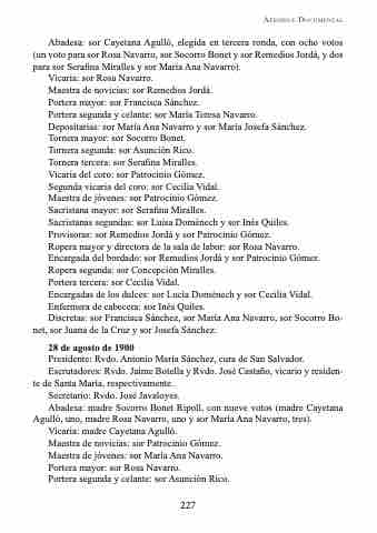 Abadesa: sor Cayetana Agulló, elegida en tercera ronda, con ocho votos (un voto para sor Rosa Navarro, sor Socorro Bonet y sor Remedios Jordá, y dos para sor Serafina Miralles y sor María Ana Navarro).