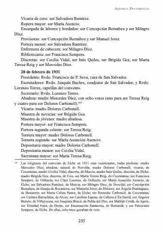 260 Las religiosas del convento de Elche en 1931 eran veinticuatro, todas profesas: madre Mercedes Díez, abadesa, natural de Novelda; madre Dolores Carbonell, vicaria, de Cocentaina; madre Cecilia Vidal, discreta, de Murcia; madre Inés Quiles, discreta, de Elche; madre Brígida Gea, discreta, de Cox; sor María Teresa Reig, de Cocentaina; sor Francisca Sempere, de Orihuela; sor Clara Lorenzo, de Orihuela; sor María Asunción Asencio, de Elche; sor Salvadora Ramírez, de Murcia; sor Milagro Díez, de Novelda; sor Concepción Bernabeu, de Granja de Rocamora; sor Manuela Jerez, de Dolores; sor Ángela Domínguez, de Beniarrés; sor María Celina Pastor, de Elche; sor Remedio Carbonell, de Cocentaina; sor Carmen Barrachina, de Alcoy; sor Carolina Espasa, de Callosa d’En Sarrià; sor Ángeles Benyto, de Villajoyosa; sor Joaquina Boscá, de Pobla del Duc; sor Matilde Cerdá, de Agres; sor Trinidad Ivars, de Denia; sor Encarnación Santacreu, de Beniardá; y sor Patrocinio Sempere, de Elche. De ellas, solo trece gozaban de voto.