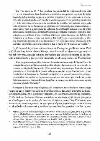 En 1o de enero de 1517, fue instalada la comunidad de religiosas de esta villa [...] y por el escribano Juan Martínez se recibió la competente escritura de haber quedado dichas madres en quieta y pacífica posesión, y a su consecuencia se cele- bró en la iglesia de dicho convento la primer misa que oyeron todos los susodichos [...] Este convento perteneció a la provincia de Castilla, por hallarse sujeta esta villa al tiempo de su fundación al obispado de Cartagena, mas transcurridos al- gunos años, pasó a la provincia de Valencia. Su institución aunque es de la orden franciscana, sus religiosas se llaman Clarisas, por haberse erigidio el convento bajo la invocación de Santa Clara. Contigua al mismo, existe una casa que habitan dos religiosos y un lego, el uno que asiste a las madres en el confesionario, el otro que desempeña las funciones de procurador, y el lego que atiende al cuidado de la sacristía. El primer confesor que hubo lo fue el padre fray Francisco de Rueda.23