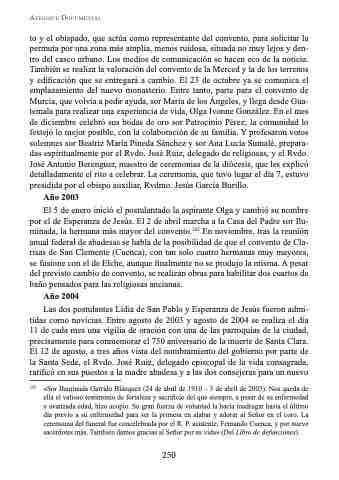 to y el obispado, que actúa como representante del convento, para solicitar la permuta por una zona más amplia, menos ruidosa, situada no muy lejos y den- tro del casco urbano. Los medios de comunicación se hacen eco de la noticia. También se realiza la valoración del convento de la Merced y la de los terrenos y edificación que se entregará a cambio. El 23 de octubre ya se comunica el emplazamiento del nuevo monasterio. Entre tanto, parte para el convento de Murcia, que volvía a pedir ayuda, sor María de los Ángeles, y llega desde Gua- temala para realizar una experiencia de vida, Olga Ivonne González. En el mes de diciembre celebró sus bodas de oro sor Patrocinio Pérez; la comunidad lo festejó lo mejor posible, con la colaboración de su familia. Y profesaron votos solemnes sor Beatriz María Pineda Sánchez y sor Ana Lucía Sumalé, prepara- das espiritualmente por el Rvdo. José Ruiz, delegado de religiosas, y el Rvdo. José Antonio Berenguer, maestro de ceremonias de la diócesis, que les explicó detalladamente el rito a celebrar. La ceremonia, que tuvo lugar el día 7, estuvo presidida por el obispo auxiliar, Rvdmo. Jesús García Burillo.