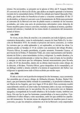 trienio. En noviembre, se presentó en la iglesia el libro del P. Joaquín Millán El convento de la Merced de Elche, que dedica un amplio apartado a la historia reciente de la comunidad clarisa. El libro fue editado por Isamel Quesada Chin- chilla, que donó todos los beneficios al autor y a nuestra comunidad. El día 13 de diciembre, se firmó el convenio con el Ayuntamiento de Elche para permutar el convento de la Merced con otro de planta nueva a construir en los terrenos acordados, así como una serie de prestaciones adicionales como dotación de bienes muebles para el nuevo convento, traslado y mudanza al mismo, ajardina- miento del entorno y traslado de los restos desde el cementerio del monasterio actual al futuro.