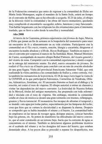 Al inicio de la Cuaresma, primera experiencia con jóvenes de Aspe, Murcia y Elche que pasan un fin de semana en la hospedería del monasterio para tener un encuentro de fe y afianzamiento en su vida cristiana. Participaron con la comunidad en el Via crucis, rosario, oración, liturgia y eucaristía; dirigieron el encuentro la madre abadesa y el Rvdo. Reyes Rodríguez. También en marzo vi- sita el convento por sorpresa el nuncio de Su Santidad, Mons. Manuel Monteiro de Castro, acompañado de nuestro obispo Rafael Palmero, del vicario general y del vicario de zona. Compartió con la comunidad experiencias y alentó a seguir en la entrega del ministerio orante. En abril, nuevo encuentro de jóvenes. Se realizó el Via crucis en el huerto para concluir con un rato de oración alrededor de una gran fogata. Visita del provincial franciscano Saturnino Vidal, que está realizando la visita canónica a las comunidades de frailes y, como cortesía, visi- ta también los monasterios de la provincia. El 28 de mayo tuvo lugar la visita de la CONFER en la que participaron Salesianos, Carmelitas de Vendruna, Obla- tas, Adoratrices, Jesuitinas, etc. El encuentro fraterno se basó en el diálogo y la oración, así como el rezo de vísperas. El obispo autorizó a entrar en clausura y visitar las dependencias del nuevo convento. La festividad de Nuestra Señora de la Merced, titular del antiguo monasterio, fue preparada con toda solemni- dad e iniciada con el rezo de vísperas. Sin embargo, mientras la comunidad estaba en clase de música se desató una gran tormenta con truenos, relámpagos, granizo y lluvia torrencial. El monasterio fue incapaz de afrontar el temporal y se inundó: caía agua por todas partes, especialmente por las lámparas del techo, cosa que hizo que se cortara la electricidad y se disparara la alarma. Después se comprobó que se había inundado el sótano y el huerto. La comunidad hubo de emplearse en las tareas de recoger agua, destapar atascos, colocar barreños bajo las goteras, etc. Se ponen de manifiesto las dificultades del nuevo conven- to, que al estar construido en un terreno bajo, hacía que la corriente de agua se concentrara en el mismo. También se detectaron algunos problemas técnicos en el acabado del sótano y en los desagües del muro del huerto, que estaban demasiado altos. A los pocos días se procedió a reparar los desperfectos, tras