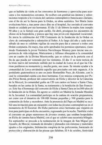 que se hallaba de visita en los conventos de hermanos y aprovecha para acer- carse a los monasterios cercanos. Se reciben con gratitud sus ánimos y exhor- taciones respecto a la vivencia del carisma contemplativo franciscano-clariano, con el fin de ser la fuerza para la Orden, su alma auténtica. Sor María Jesús evoluciona bien y, tras pasar cinco días en el hospital, fue enviada al convento donde es cuidada por sus hermanas. El día 11 de febrero la madre Ana cumple 90 años y se le festejó con gran cariño. En abril, prosiguen los encuentros de chicas en la hospedería, y parece que hay una joven con inquietud vocacional. Se inicia la celebración del VIII Centenario de la fundación de la Orden en clave de contemplación y adoración al Señor. A lo largo del año y cada tercer sábado de mes se celebran vigilias de oración para dar a conocer a todos esta Orden centenaria. En mayo, tras serle aprobados los permisos oportunos, viene desde Guatemala la joven Verónica Navichoque Monroy para iniciar una ex- periencia de vida religiosa. Maricarmen y Alfonso obsequian a la comunidad con un cuadro de la Divina Misericordia, que se coloca en la portería con el fin de que pueda ser venerado por los visitantes. El día 11 se tiene noticia de la triste nueva del terremoto sufrido por la ciudad de Lorca en el que las Cla- risas perdieron su monasterio y, mucha gente, sus casas. Se intenta ayudar a la comunidad de Lorca enviándole aquello que precisaba con más urgencia. A la postulante guatemalteca se une en junio Bernarditte Paez, de Alicante, con lo cual la comunidad cuenta con doce hermanas. Con música compuesta por Pe- dro Pérez Berná, profesor del conservatorio de Elche y director de la Camerata de la Merced, la comunidad graba un CD con cantos en honor a Santa Clara, basados en las cartas de la Santa, su testamento y la bendición de San Francis- co. Este fue el homenaje del convento de Elche a Santa Clara en los 800 años de la fundación de la Orden. En agosto se celebró en Madrid la Jornada Mundial de la Juventud. La comunidad participa en la cadena de oración preparatoria, así como con el donativo de 100.000 formas pequeñas y 300 grandes para la comunión de fieles y sacerdotes. Ante la presencia del Papa en Madrid se reci- bió una invitación para un encuentro con todas las jóvenes contemplativas en el monasterio de El Escorial. De Elche partieron cinco hermanas que viajaron en tren para participar en dicho encuentro, regresando por la noche. También visitó el convento un grupo numerosos de jóvenes croatas, que estaban hospedados en Elche de camino hacia Madrid, con el que se celebró una eucaristía bilingüe. En septiembre se procede a la restauración de la imagen de San Miguel por Asoarte, de Murcia: resanado de dorados y plateados con sistemas y materiales iguales a los originales, hidratación completa de las policromías, barnizado de protección y elaboración de las piezas que faltaban. El 4 de octubre, festividad