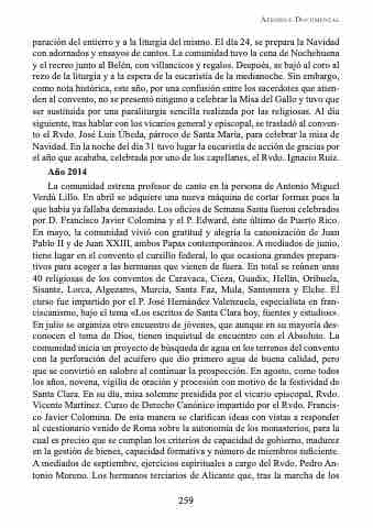 paración del entierro y a la liturgia del mismo. El día 24, se prepara la Navidad con adornados y ensayos de cantos. La comunidad tuvo la cena de Nochebuena y el recreo junto al Belén, con villancicos y regalos. Después, se bajó al coro al rezo de la liturgia y a la espera de la eucaristía de la medianoche. Sin embargo, como nota histórica, este año, por una confusión entre los sacerdotes que atien- den al convento, no se presentó ninguno a celebrar la Misa del Gallo y tuvo que ser sustituida por una paraliturgia sencilla realizada por las religiosas. Al día siguiente, tras hablar con los vicarios general y episcopal, se trasladó al conven- to el Rvdo. José Luis Úbeda, párroco de Santa María, para celebrar la misa de Navidad. En la noche del día 31 tuvo lugar la eucaristía de acción de gracias por el año que acababa, celebrada por uno de los capellanes, el Rvdo. Ignacio Ruiz.