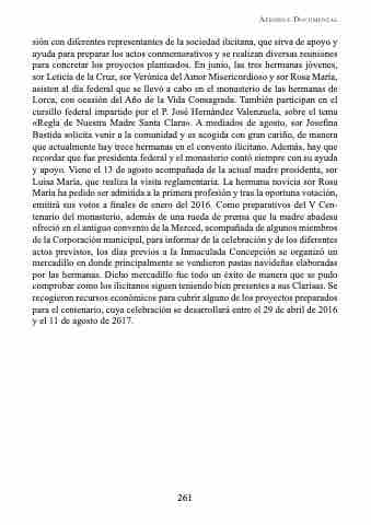 sión con diferentes representantes de la sociedad ilicitana, que sirva de apoyo y ayuda para preparar los actos conmemorativos y se realizan diversas reuniones para concretar los proyectos planteados. En junio, las tres hermanas jóvenes, sor Leticia de la Cruz, sor Verónica del Amor Misericordioso y sor Rosa María, asisten al día federal que se llevó a cabo en el monasterio de las hermanas de Lorca, con ocasión del Año de la Vida Consagrada. También participan en el cursillo federal impartido por el P. José Hernández Valenzuela, sobre el tema «Regla de Nuestra Madre Santa Clara». A mediados de agosto, sor Josefina Bastida solicita venir a la comunidad y es acogida con gran cariño, de manera que actualmente hay trece hermanas en el convento ilicitano. Además, hay que recordar que fue presidenta federal y el monasterio contó siempre con su ayuda y apoyo. Viene el 13 de agosto acompañada de la actual madre presidenta, sor Luisa María, que realiza la visita reglamentaria. La hermana novicia sor Rosa María ha pedido ser admitida a la primera profesión y tras la oportuna votación, emitirá sus votos a finales de enero del 2016. Como preparativos del v Cen- tenario del monasterio, además de una rueda de prensa que la madre abadesa ofreció en el antiguo convento de la Merced, acompañada de algunos miembros de la Corporación municipal, para informar de la celebración y de los diferentes actos previstos, los días previos a la Inmaculada Concepción se organizó un mercadillo en donde principalmente se vendieron pastas navideñas elaboradas por las hermanas. Dicho mercadillo fue todo un éxito de manera que se pudo comprobar como los ilicitanos siguen teniendo bien presentes a sus Clarisas. Se recogieron recursos económicos para cubrir alguno de los proyectos preparados para el centenario, cuya celebración se desarrollará entre el 29 de abril de 2016 y el 11 de agosto de 2017.