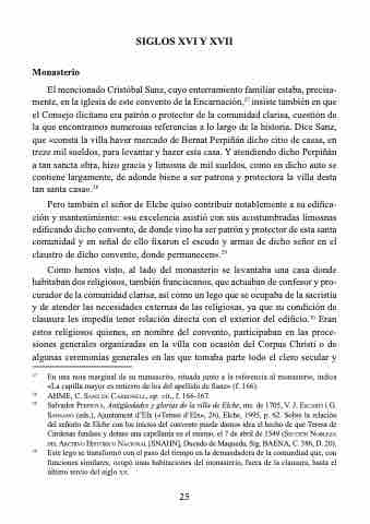 Salvador peRpINyà, Antigüedades y glorias de la villa de Elche, ms. de 1705, V. J. escaRtí i G. saNsaNo (eds.), Ajuntament d’Elx («Temes d’Elx», 26), Elche, 1995, p. 62. Sobre la relación del señorío de Elche con los inicios del convento puede darnos idea el hecho de que Teresa de Cárdenas fundase y dotase una capellanía en el mismo, el 7 de abril de 1549 (seccIóN NoBleza del aRchIvo hIstóRIco NacIoNal [SNAHN], Ducado de Maqueda, Sig. BAENA, C. 386, D. 20). Este lego se transformó con el paso del tiempo en la demandadera de la comundiad que, con funciones similares, ocupó unas habitaciones del monasterio, fuera de la clausura, hasta el último tercio del siglo xx.