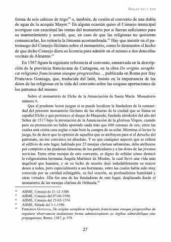 En 1587 figura la siguiente referencia al convento, enmarcada en la descrip- ción de la provincia franciscana de Cartagena, en la obra De origine seraphi- cæ religionis franciscanæ eiusque progressibus..., publicada en Roma por fray Francisco Gonzaga, que, traducida del latín, insiste en la importancia de las dotes de las religiosas en la vida del convento sobre las exiguas aportaciones de los patronos del mismo: