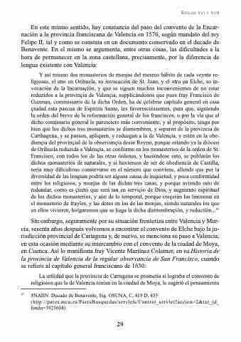 En este mismo sentido, hay constancia del paso del convento de la Encar- nación a la provincia franciscana de Valencia en 1570, según mandato del rey Felipe II, tal y como se constata en un documento conservado en el ducado de Benavente. En el mismo se argumenta, entre otras cosas, las dificultades a la hora de permanecer en la zona castellana, precisamente, por la diferencia de lengua existente con Valencia: