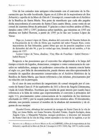 Uno de los censales más antiguos relacionado con el convento de la En- carnación que ha sido localizado, figura en el Llibre de la majordomia de Sen Sebastià y capella de la Mare de Déu de l’Assumpció, conservado en el Archivo de la Basílica de Santa María. Nos pone de manifiesto que cada año pagaba dicha mayordomía al convento de Santa Clara cuatro libras, como renta de un censal de cuarenta libras de principal. Y gracias a cinco recibos unidos al libro, datados entre 1593 y 1597, podemos saber también, que mientras en 1593 era abadesa sor Isabel Herrera, a partir de 1595 ya lo fue sor Leonor López de Varea: