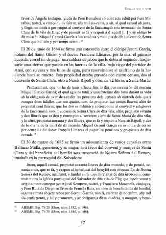 El 20 de junio de 1684 se firma una concordia entre el clérigo Jeroni García, notario del Santo Oficio, y el doctor Francesc Llinares, por la cual el primero acuerda, con el fin de pagar una caldera de jabón que le debía al segundo, traspa- sarle unas tierras que poseía en las huertas de la villa, bajo riego del partidor de Anoi, con su casa y tres hilos de agua, pero reservándose el usufructo de la ha- cienda hasta su muerte. Esta propiedad estaba gravada con cuatro censos, dos al convento de Santa Clara, otro a Narsís Ripoll y otro, de 72 libras, a Santa María: