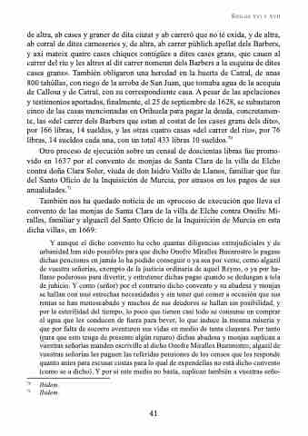 Otro proceso de ejecución sobre un censal de doscientas libras fue promo- vido en 1637 por el convento de monjas de Santa Clara de la villa de Elche contra doña Clara Soler, viuda de don Isidro Vaillo de Llanos, familiar que fue del Santo Oficio de la Inquisición de Murcia, por atrasos en los pagos de sus anualidades.71