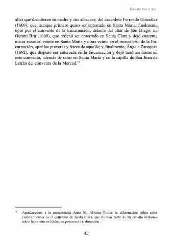 altar que decidieran su madre y sus albaceas; del sacerdote Ferrando González (1609), que, aunque primero quiso ser enterrado en Santa María, finalmente optó por el convento de la Encarnación, delante del altar de San Diego; de Geroni Bru (1609), que ordenó ser enterrado en Santa Clara y dejó cuarenta misas rezadas: veinte en Santa María y otras veinte en el monasterio de la En- carnación, «per los preveres y frares de aquell»; y, finalmente, Àngela Zaragoza (1692), que dispuso ser enterrada en la Encarnación y dejó también misas en este convento, además de otras en Santa María y en la capilla de San Juan de Letrán del convento de la Merced.79