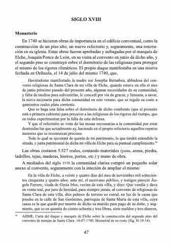 En 1740 se hicieron obras de importancia en el edificio conventual, como la construcción de un piso alto, un nuevo refectorio y, seguramente, una renova- ción en su iglesia. Estas obras fueron aprobadas y sufragadas por el marqués de Elche, Joaquín Ponce de León, en su visita al convento en junio de dicho año, y el segundo piso se construyó sobre el dormitorio de las religiosas para proteger el mismo de los rigores climáticos. El propio duque manifestaba en una misiva fechada en Orihuela, el 14 de julio del mismo 1740, que,