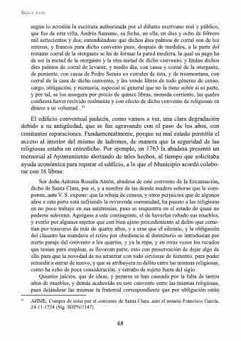 Sor doña Antonia Rosalía Antón, abadesa de este convento de la Encarnación, dicho de Santa Clara, por sí, y a nombre de las demás madres señoras que le com- ponen, ante V. S. expone: que la rebaja de censos, y otros perjuicios que de algunos años a esta parte está sufriendo la reverenda comunidad, ha puesto a las religiosas en no poco trabajo en sus asistensias, pues se enquentra en el estado de quasi no poderse subvenir. Agrégase a este contingente, el de haverlas robado sus muebles, y averío por algunos sujetos que con bien ajeno procedimiento al delito que come- tían por trascurso de más de quatro años, y a oras que el silensio, y la obligasión del claustro las mandava el retiro por obediencia al dormitorio se introdusían por sierto paraje del convento a los quartos, y ya la ropa, y en otras vezes los recados que tenían para emplear, se llevavan parte, esto con preservación de dejar algo de ello para que la novedad de no arrastrar con todo sirviesse de fomento, para poder reinsidir a entrar de nuevo, y que se atribuyera su delito entre las mismas religiosas, como ha echo de poca consideración, y estraño de sujeto fuera del siglo.